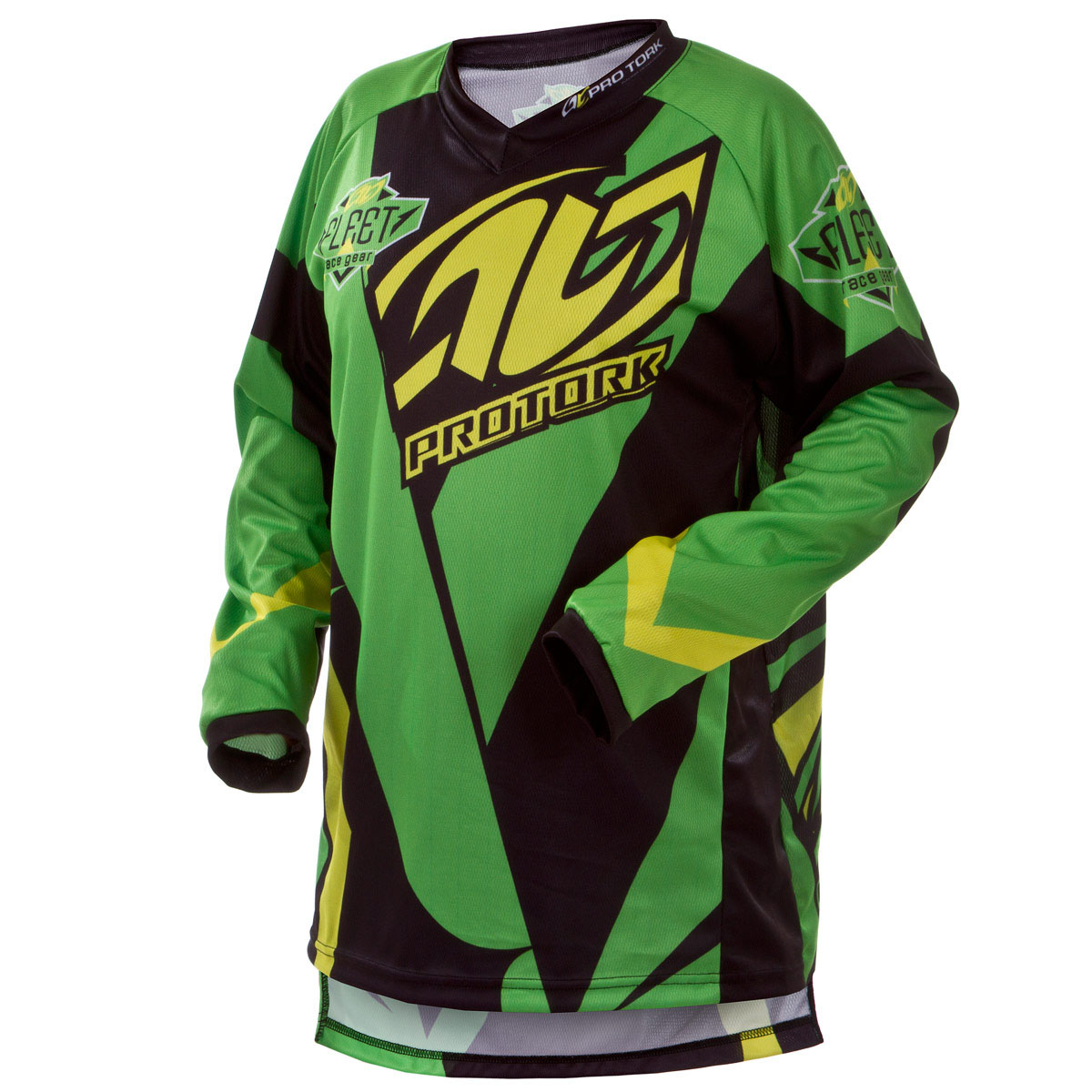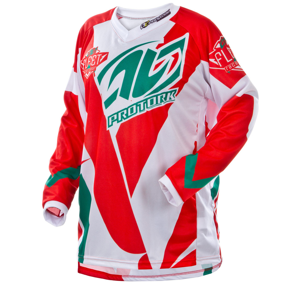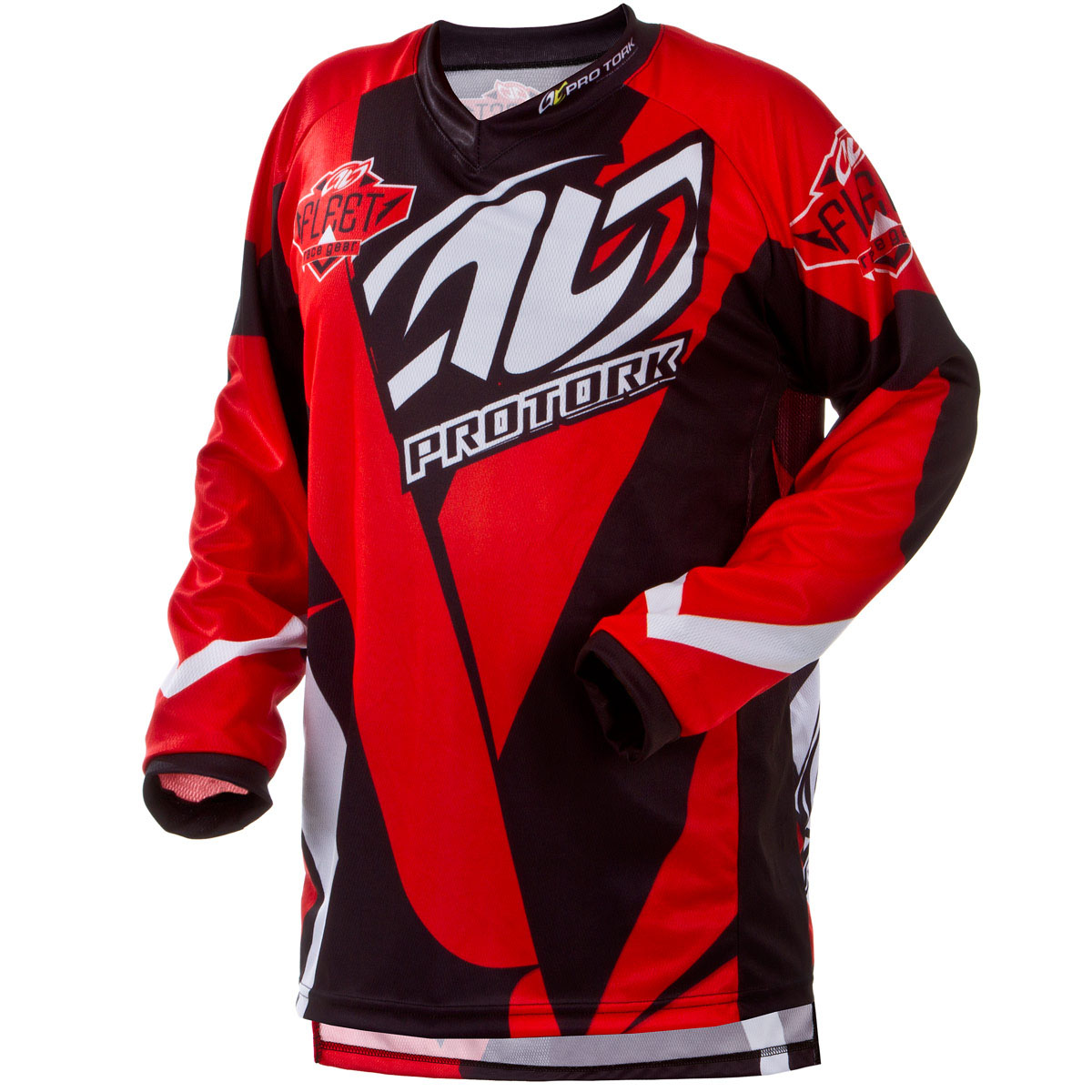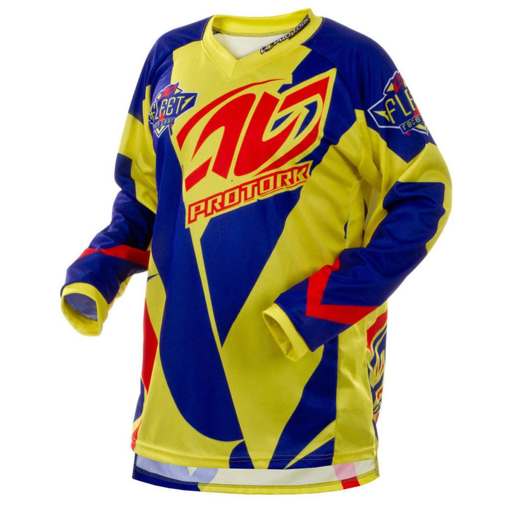 Tecido 100% poliéster; Apliques emborrachados; Grafismos sublimados; Cauda alongada; Gola V; Testada sob as mais extremas condições de uso pela Pro Tork Racing Team.